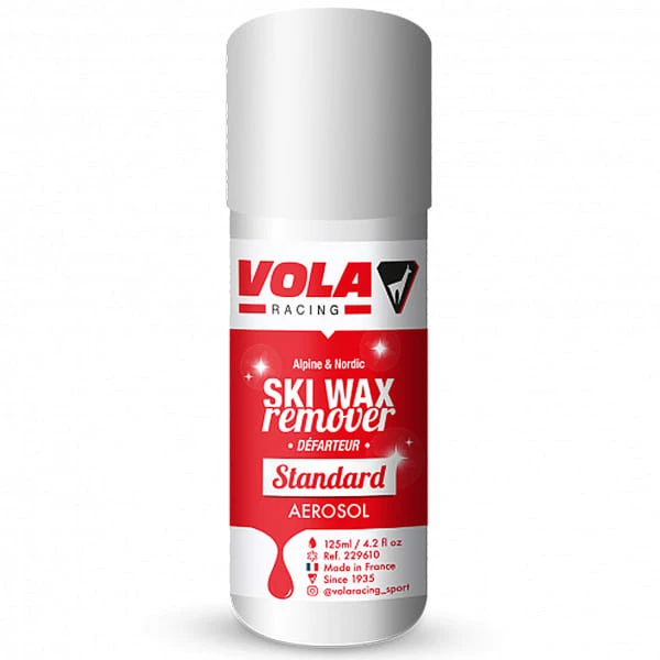 The Liquid Wax Remover 125 ML STANDARD AROSOL from Vola is a liquid solvent spray to clean tools (waxing iron, scrapers, …) and remove old wax from the soles of skis and snowboards. This product is applied with a rag.